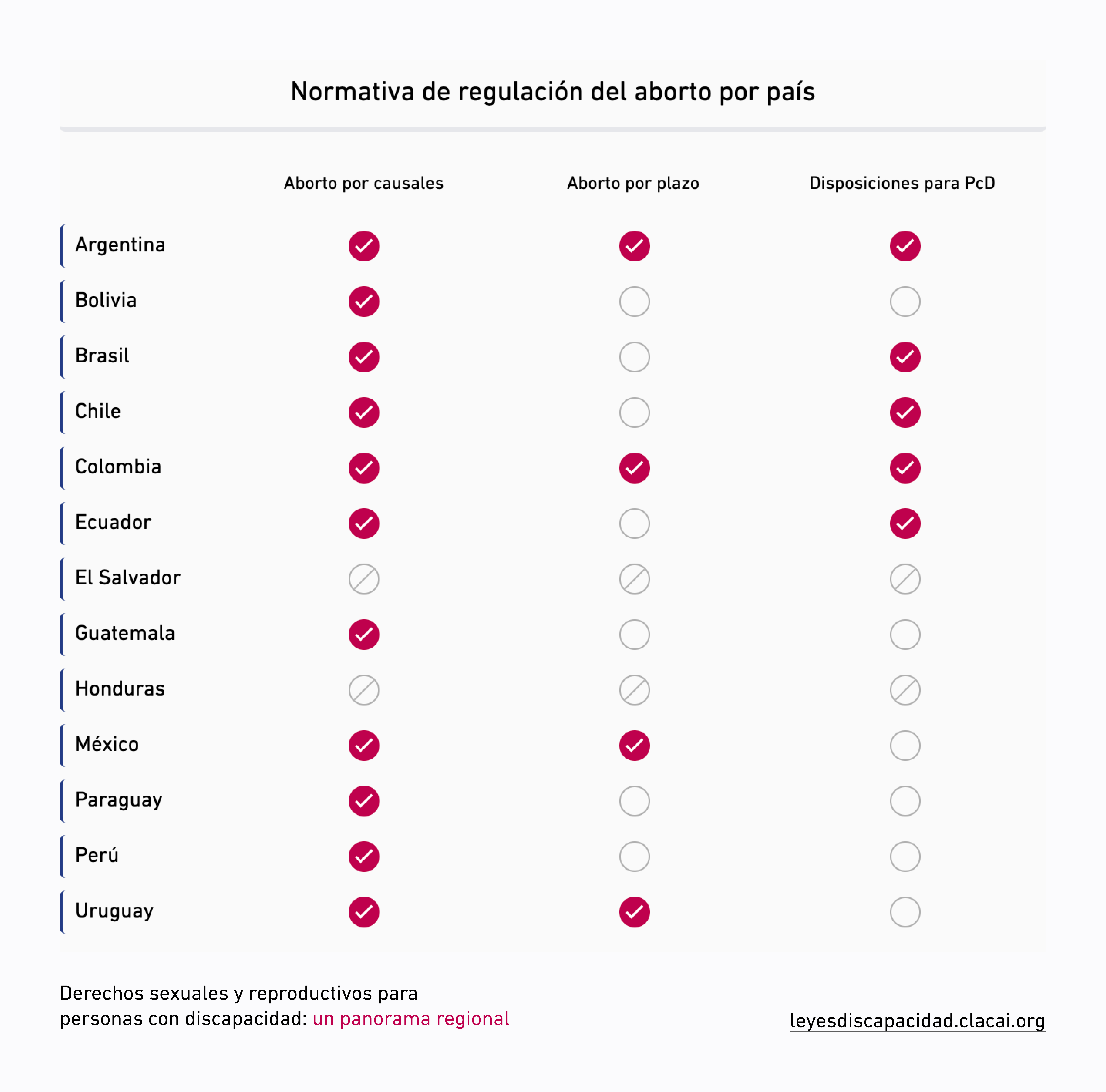 Todos los países menos El Salvador y Honduras tienen algún tipo de normativa de regulación del aborto. En Bolivia, Brasil, Chile, Ecuador, Guatemala, Paraguay y Perú la normativa contempla aborto por causales. De esos países solo Brasil, Chile y Ecuador tienen disposiciones específicas para personas con discapacidad. Argentina, Colombia, México y Uruguay también regulan el aborto por plazos. Pero solo Argentina y Colombia tienen disposiciones específicas para personas con discapacidad.