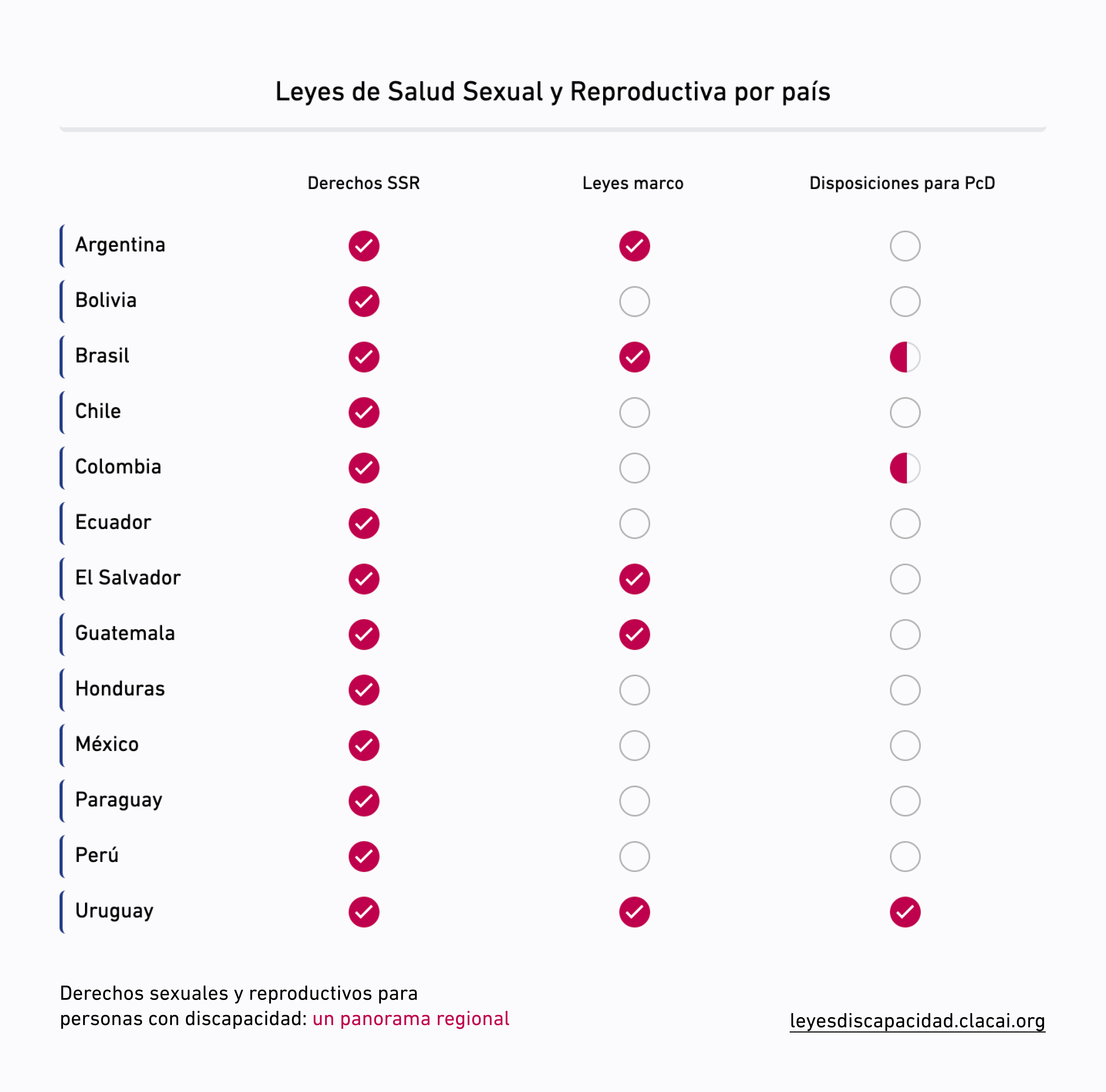 Todos los países de la región reconocen a la salud sexual y reproductiva como un derecho, sin embargo, solo Argentina, Brasil, El Salvador, Guatemala y Uruguay tienen una ley marco. Respecto a las disposiciones específicas sobre salud sexual y reproductiva para personas con discapacidad, Uruguay las reconoce dentro de su ley marco, Brasil lo hace de manera negativa y Colombia sentó jurisprudencia sobre este asunto.