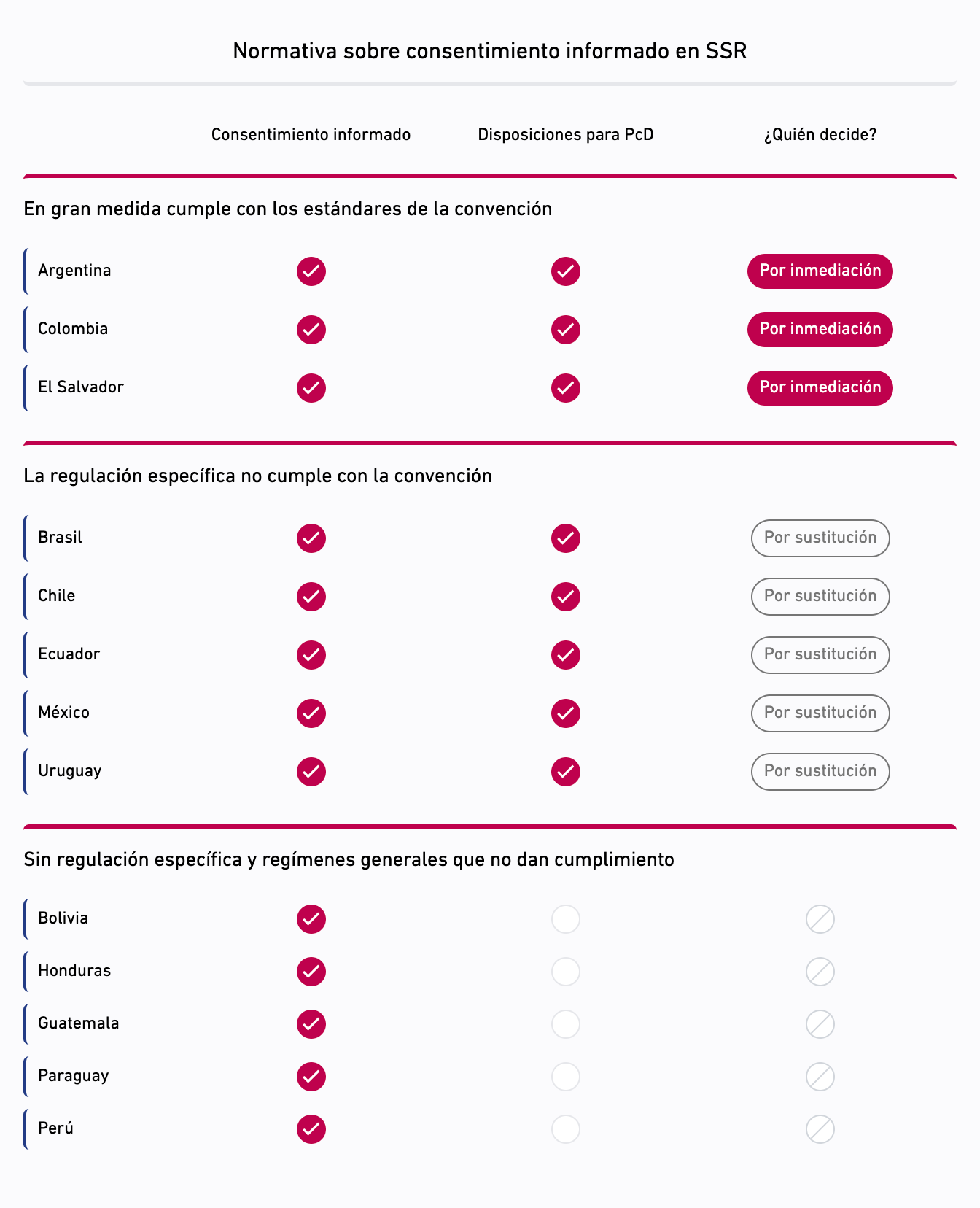 Sin embargo, en algunos países (Brasil, Chile, Ecuador, México y Uruguay) persisten regulaciones sobre consentimiento informado en general y en particular para el acceso a prácticas de SSR, incluyendo el aborto, que se basan en modelos de sustitución, en los cuales son representantes legales, jueces/as o funcionarias/os administrativas quienes toman las decisiones relativas a la salud de las personas con discapacidad. En los países restantes, Bolivia, Perú, Honduras y Guatemala, las regulaciones no contemplan normas específicas para el consentimiento informado y mantienen regímenes generales de sustitución de las decisiones para personas con discapacidad.